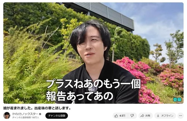 「娘が産まれました。出産後の妻と話します。」と題した動画でかのさんは、先日投稿した結婚報告の動画に言及し、「マジで申し訳ない。今までずっと黙っててね」とあらためて謝罪。続けて「プラスもう1個、報告があって」とし、「お子さんできたんですよね、普通に」と明かした。