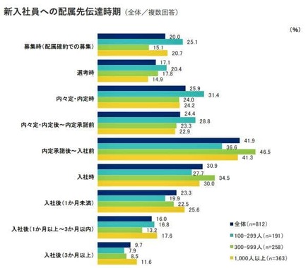 まず、新入社員に配属先を伝達した時期を聞くと、「内定承諾前」が34.6%、「内定承諾後~入社前」が24.4%、「入社時以降」が41.1%と、入社後が一番多い結果となった【図表1】。