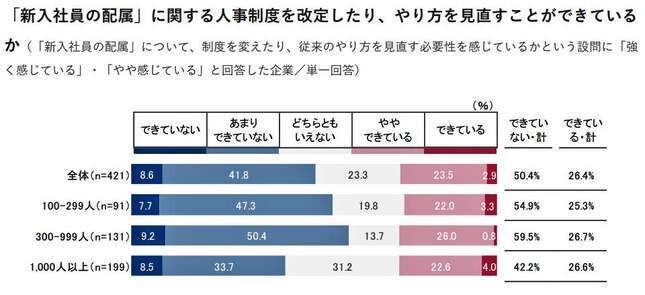 一方、新入社員の配属に関し、従来の人事制度や選考方法を見直す必要性を感じている企業は半数以上(51.8%)いる。【図表2】は、人事担当者に見直し状況を聞いたグラフだが、3割~5割が「見直しができていない」と答えている。