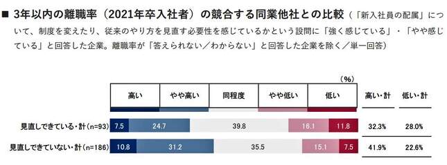 実際、新入社員の3年以内の離職率(2021年卒入社者)を聞くと、「見直しできていない企業」のほうが、「見直しできている企業」より、約10ポイント高かった【図表3】。