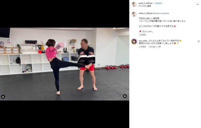 6月5日の投稿では、元キックボクシング選手のトレーナー、齊藤淳さんのレッスンを受ける動画を公開。ミットに勢いよくパンチやキックを繰り出す山川さんの姿がおさめられている。
