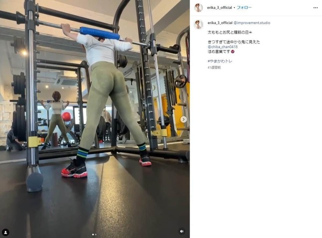 山川さんはインスタグラムで、ジムでトレーニングに励む動画をたびたび公開している。