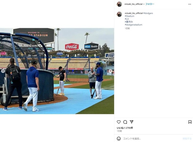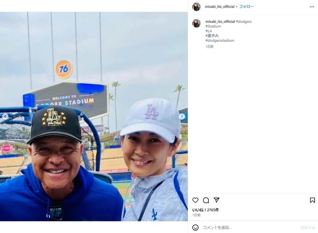 そんな伊東さんが6月5日、インスタグラムで、夏休みにロサンゼルスのドジャー・スタジアムを訪れたことを報告。ドジャースのウィル・スミス選手のボブルヘッド(首振り人形)や、グラウンドレベルで撮影されたスタジアム内の写真、動画を公開し、4枚目にロバーツ監督との2ショットもアップした。