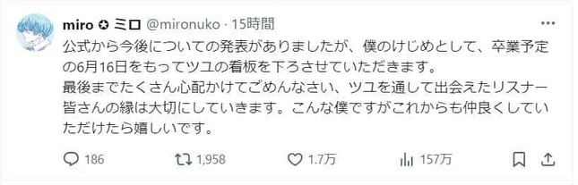 「今後、メンバーの礼衣とmiro、サポートスタッフのAzyuNとマネージャーは、ツユとしての活動は行いません。また、ぶす氏にも関与いたしません」