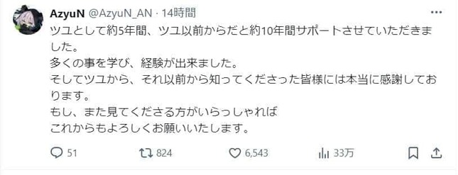 ツユ公式Xは8日、「今後の活動に関して」とする報告を行った。
