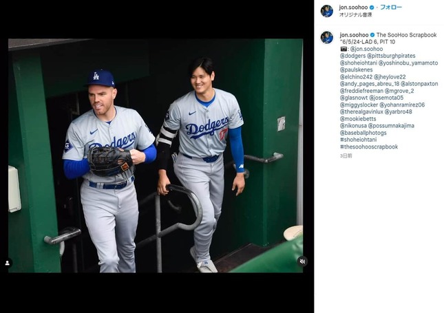 スーフーさんの投稿には「素晴らしい撮り方で選手達の本当の姿が伝わってきます心躍る素敵な写真をいつもありがとう」「流石ドジャース専属カメラマン」などのコメントが見られた。