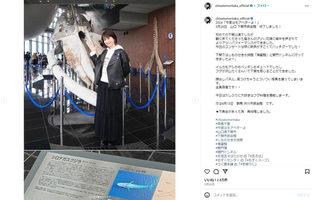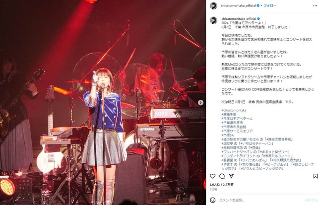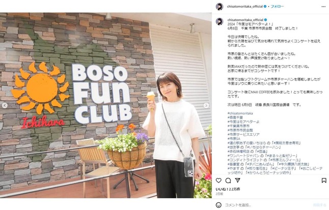森高さんは「市原では梨ソフトクリームや市原チャーハンを堪能しましたが今度はゾウに乗りに来たいと思いまーす! コンサート後にMAX COFFEEも飲みました! とっても美味しかったです」と市原の思い出を語った。