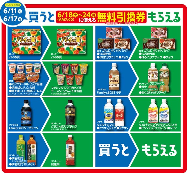 ファミリーマートは2024年6月4日~24日、対象商品を1個買うと対象の商品と引き換えられる無料引換券(レシートクーポン)を1枚プレゼントする「1個買うと、1個もらえる」キャンペーンを開催している。