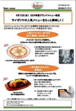 イタリアンレストランの「サイゼリヤ」は2024年6月12日から夏の新メニュー2品を追加し、「バッファローモッツァレラのマルゲリータピザ」(400円、以下すべて税込み)と「ミックスグリル」(650円)」が登場する。