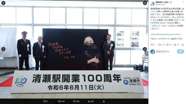 11日に実施された清瀬駅開業100周年記念式典では、中森さん直筆のメッセージボードも披露されたという。また、式典には清瀬市出身の俳優・釈由美子さんやお笑いコンビ「中川家」の礼二さんも出席した。