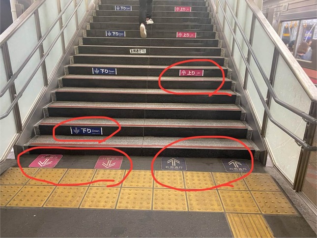 階段には、右側通行を促すための案内サインが張られている。左半分の段の側面には「下り」と紺色で、右半分には「上り」とピンク色で表記がある一方、階段手前の床に示された矢印は下りがピンク色で上りが紺色。進行方向ごとに色分けされていない状態だ。