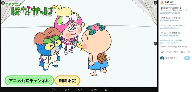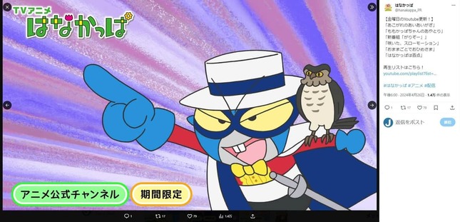 テレビアニメ「はなかっぱ」(NHK Eテレ)の2024年6月14日放送回で、声優の山口勝平さんが声を演じる「がりぞー」が、「名探偵コナン」(読売テレビ・日本テレビ系)のキャラクター・怪盗キッドのような姿に扮するシーンがあった。怪盗キッドも山口さんが演じており、「中の人つながり」としてXで注目を集め、「はなかっぱ」が一時トレンド入りした。