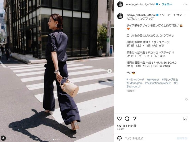 24年6月13日に西内さんは、トリー バーチ サマーカプセル ポップアップの告知と共に写真をインスタグラムに投稿した。コメント欄には「まりやちゃんかっこいい!!」、「のびのびしている顔している!」などのコメントが寄せられた。