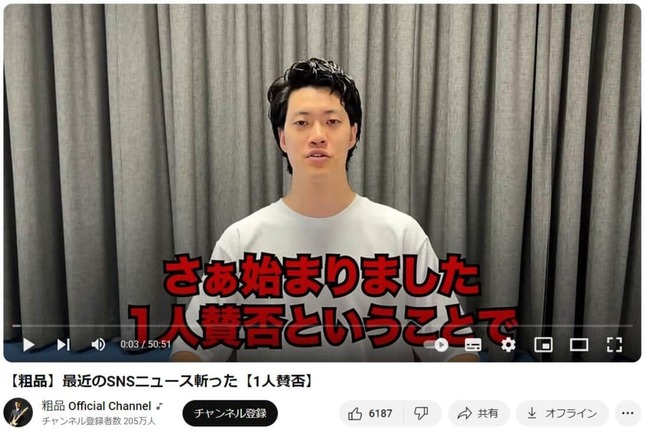 今回の動画は、粗品さんが直近で話題になったニュースに意見する人気企画「1人賛否」。その中で粗品さんは、藤本さんの元妻・木下優樹菜さんがインスタグラムのストーリーズで、集中した様子で姿勢よく車を運転する藤本さんを目撃したと投稿したことに触れた。