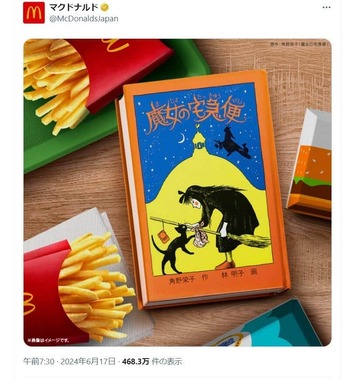 マクドナルドの公式Xは6月17日、児童書「魔女の宅急便」(原作・角野栄子、作画・林明子)の書籍を中央に据え、その周囲には「マックフライポテト」を配置したアピール画像を投稿した。