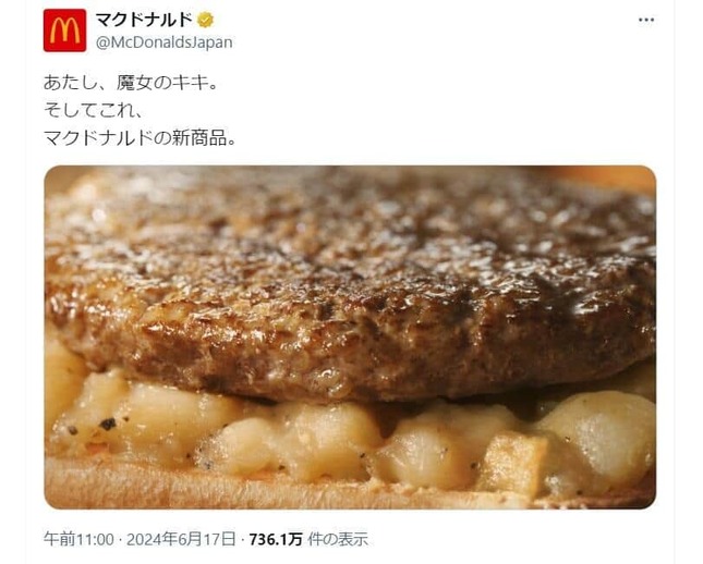 さらに17日には「あたし、魔女のキキ。」「そしてこれ、マクドナルドの新商品」という文章とともに、ハンバーガーの一部と思われる商品画像を投稿した。つづいて翌18日には、「だれだかわかりますか?」という文章とともに、キャラクターのシルエット画像の公開もあった。