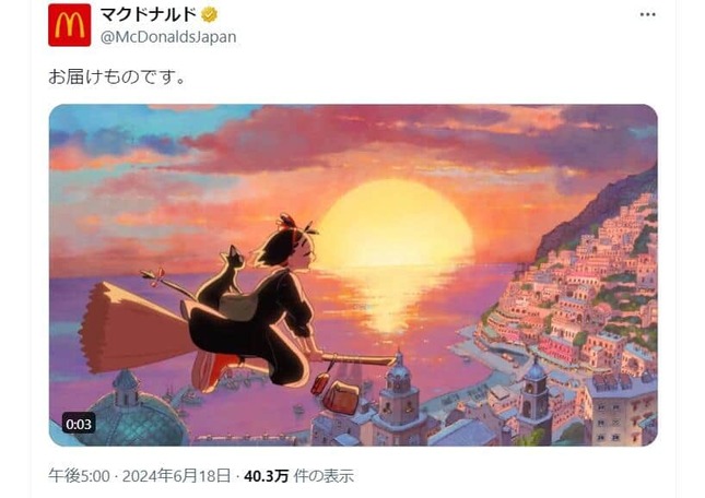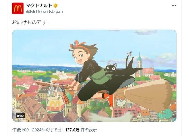 これだけではなかった。18日の投稿では、「お届けものです。」として、同書の主人公・魔女のキキ、キキの相棒・黒猫のジジと思われるキャラクターが、ホウキで空を飛び、しかもマクドナルドの商品を運んでいるアニメーションを公開した。