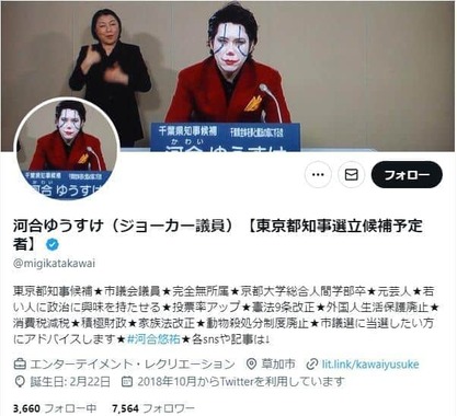 河合氏は、赤いスーツに顔を白塗りにした姿で「ジョーカー議員」として活動してきた。今回は顔を緑色に塗り、黄色いスーツで活動するようだ。