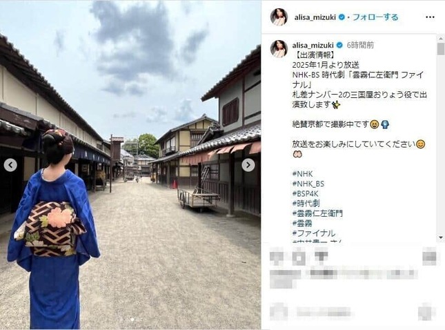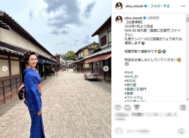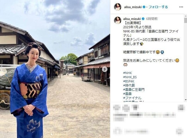 観月さんは2025年1月から放送のNHK‐BS時代劇「雲霧仁左衛門 ファイナル」に三国屋おりょう役で出演するとのことで、撮影時の着物姿の写真を4枚公開した。現在は京都で撮影中だと明かしており、セットの街並みと鮮やかな着物のコントラストが映える美しいショットとなっている。