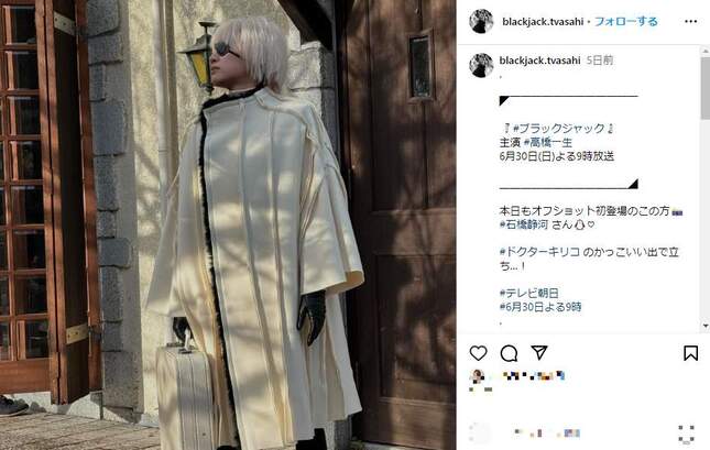 ドラマ公式インスタグラムでは16日、「本日もオフショット初登場のこの方 #石橋静河 さん #ドクターキリコ のかっこいい出で立ち...!」として石橋さん演じるキリコのビジュアルを公開している。