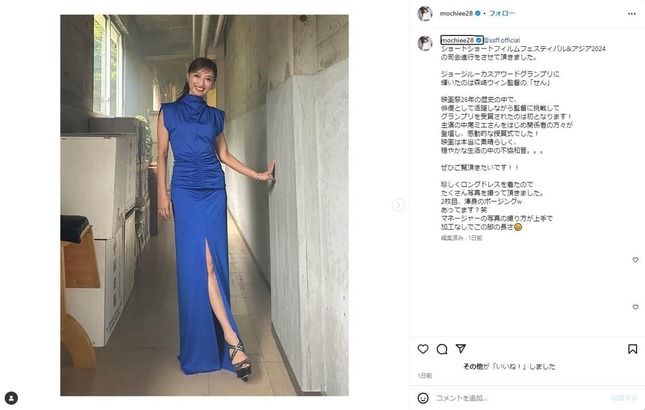 24年6月18日、望月さんは国際短編映画祭「ショートショート フィルムフェスティバル & アジア2024」に登壇したことを報告。青いドレス姿で撮影した写真を投稿し、「美しすぎませんか」、「綺麗でスタイル良すぎる」などの称賛を集めた。