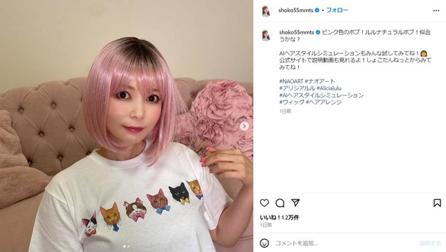 中川さんは「ピンク色のボブ! ルルナチュラルボブ! 似合うかな?」とし、ピンクのボブヘア姿を公開した。「AIヘアスタイルシミュレーションもみんな試してみてね!」というように、髪型や色は加工したもののようだ。