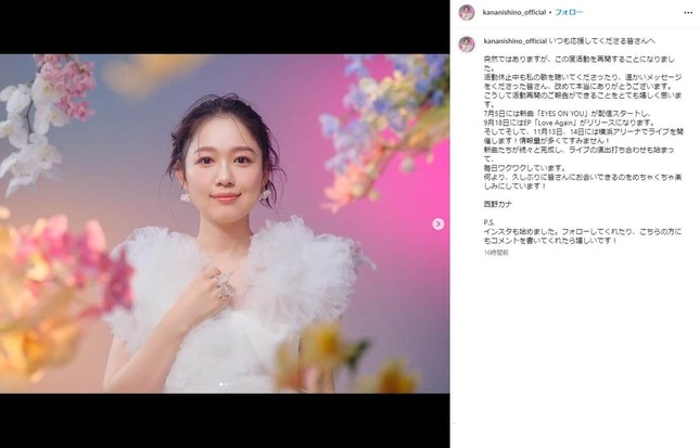 休止前は明るい髪色に濃いアイメイクの印象が強かった西野さんだが、新ビジュアルでは暗い色の髪に白い衣装をまとい、メイクも以前よりナチュラルになったように見える。