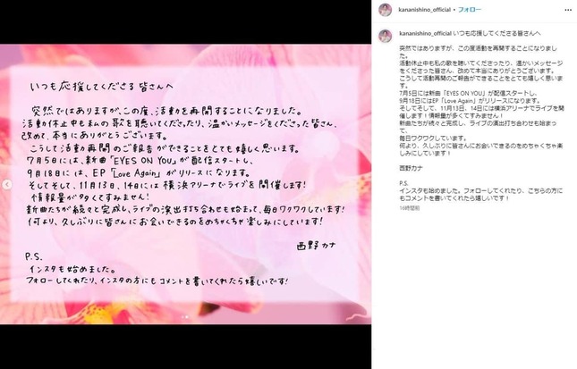 今回の活動再開にあたり、西野さんは6月25日、Xと同日開設したインスタグラムで直筆のメッセージを公開。
