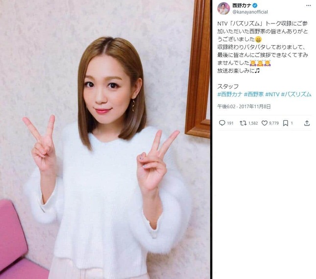 西野カナさんのX(@kanayanofficial)より。2017年11月の投稿