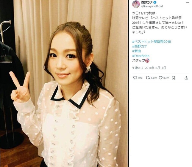 • 西野カナさんのX(@kanayanofficial)より。2017年11月の投稿