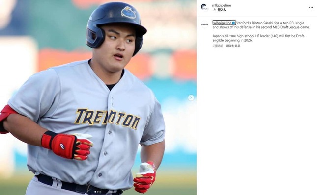 佐々木選手はMLBドラフトリーグ「トレントン」の一員として、ステートカレッジ戦に「5番DH」で出場。4回にバックスクリーンへ放り込む飛距離約124メートルの豪快な3号本塁打を放った。