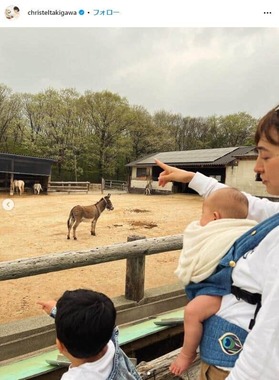 滝川さんは「また少し遠出をしてきました」とし、青空が広がる牧場らしき場所で、娘を抱えながら息子と歩いている写真を公開した。投稿文では、