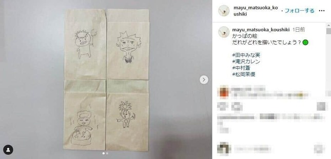 松岡さんは「かっぱの絵だれがどれを描いたでしょう?」とクイズ形式で投稿しており、4人それぞれが描いた河童の絵を写真に収めた。愛らしいキャラクター調の左上、少し角ばった右上、風呂のようなものに浸かった左下、寸詰まり気味な右下と、どれもユニークな河童となっており、絵だけで誰が描いたかを当てるのは難解だ。