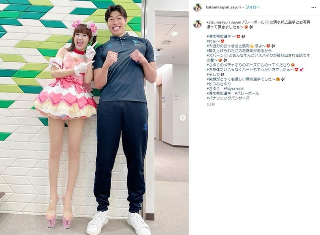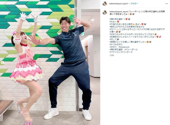 さゆりさんも24日、インスタグラムで「バレーボールの清水邦広選手とお写真撮って頂きましたぁ~」として、全身を写した2ショットや、2人でおどけたポーズを取る写真を公開。「#大迫力のおっきさと筋肉ぼよ~」「#さゆりのメチャぶりのポーズにものってくださり」「#お身体だけじゃなくハートもでっかい方でしたぁ~」などのハッシュタグを添えた。