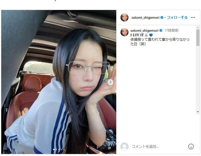 「35歳に見えない」と話題の重盛さんはこの日、「I LUV IT 体操服って言われて車から降りなかった日(笑)」として、白地に青いラインが入ったTシャツとショートパンツ、白いスニーカーに眼鏡姿の写真を公開した。眼鏡に手を添えウインクするショットや、アヒル口、舌をペロっと出したショットなど車内で撮影された計5枚の画像をアップしている。