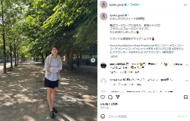 日本テレビの郡司恭子アナウンサー(33)が2024年6月21日にインスタグラムで、太ももがあわらになった美脚をのぞかせた私服姿を披露した。