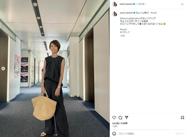 辺見さんはインスタグラムで「ちょっと前の #ootd(今日のコーディネート)」として、ノースリーブとワイドパンツの「ちょっとスポーティーな生地」のセットアップを身に着け、大きなかごバッグを手にした写真を公開。「かごバッグで外して夏っぽくなればいいなと」とつづった。