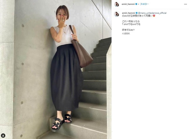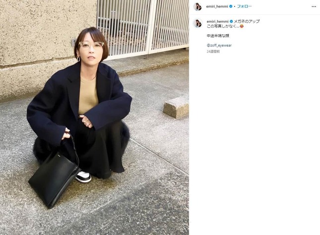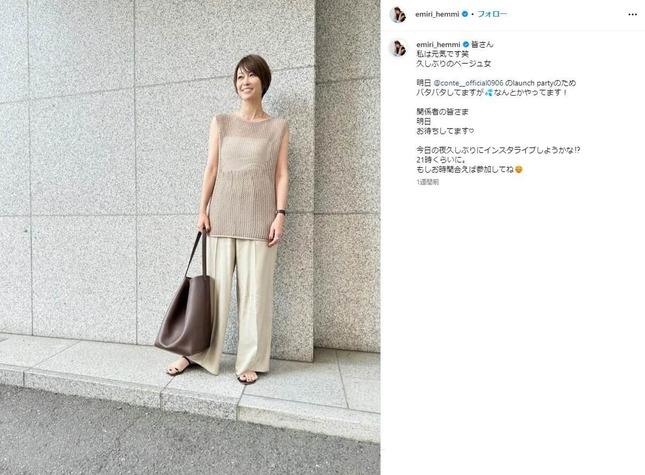 タレントの辺見えみりさん(47)が2024年6月29日にインスタグラムを更新し、私服コーディネートを公開した。SNSでは「かわいい」「素敵」などの声が上がっている。