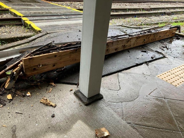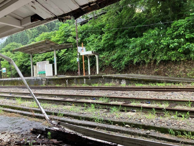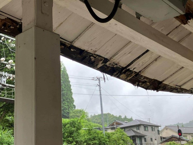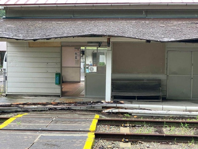 写真をみると、線路と地続きに建つ駅舎の軒先が一部崩れている。木板のほか、雨どいが地面にねじれ落ちている様子だ。「久々に死ぬかと思ったわ」としながら、JR側に知らせるとしていた。