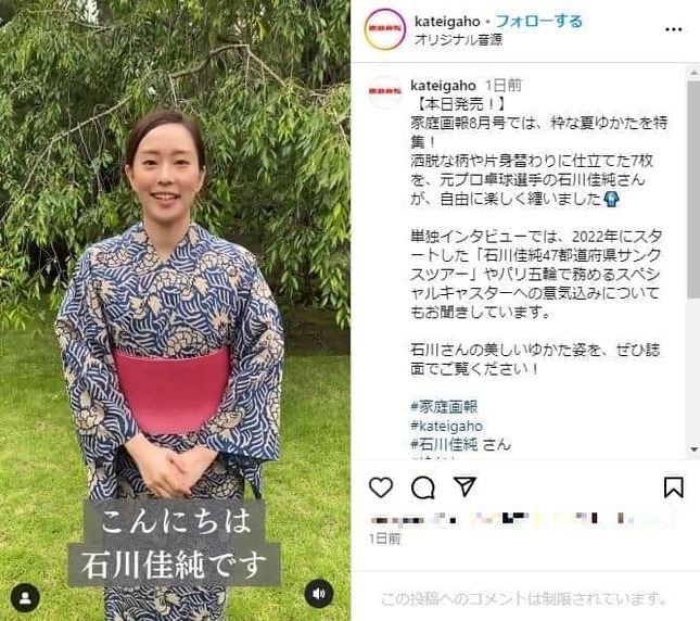石川さんは、同日に発売された「家庭画報」(世界文化社)8月号に取り上げられており、「素敵な7枚の夏ゆかたを着させて頂きました」と報告した。