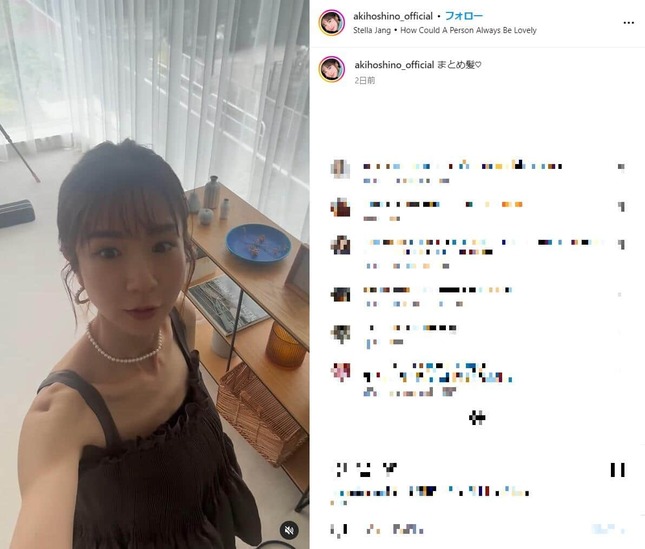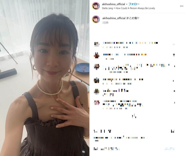タレントのほしのあきさん(47)が2024年7月1日、インスタグラムで髪をアップにまとめた「まとめ髪」をした姿を公開し、話題になっている。