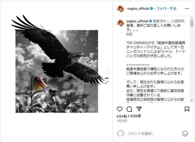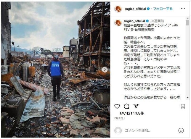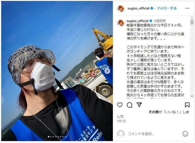 SUGIZOさんは音楽活動のかたわら、東日本大震災以降、被災地でのボランティアを精力的に続けている。元日に起こった能登半島地震でも、複数回にわたって石川県珠洲市や輪島市などを訪れ支援活動を行っている。