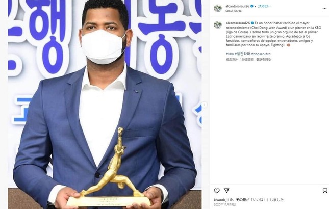ドミニカ共和国出身のアルカンタラは、大リーグのオークランド・アスレチックスから18年オフにKBOのKTウィズに入団。19年オフに斗山ベアーズに移籍し、20勝をマークして最多勝のタイトルを獲得した。