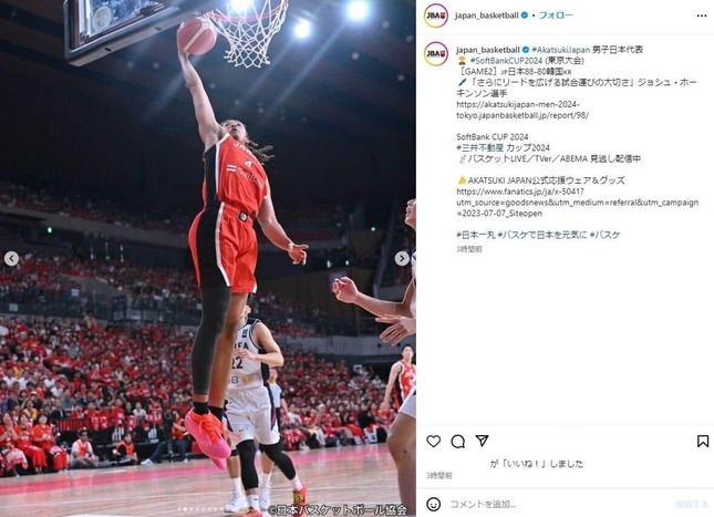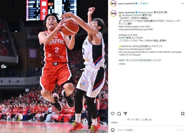 試合は第1クォーターを19-22で韓国にリードされるも、第2クォーター、第3クォーターと盛り返して逆転。第4クォーターは20-23と韓国に追い上げられたが、88-80で日本が競り勝った。