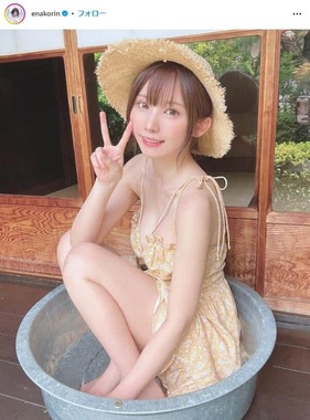 えなこさんは縁側で「たらい」の中に座り込み、ピースサインをした自身の写真を披露した。麦わら帽子をかぶり、胸元が大きく開いた薄オレンジ色の花柄ワンピースを着ている。