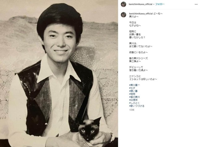 さらに7日には、「昔の美川シリーズ第二弾」として、「デビューして落ち着いた頃」の、猫を抱いた自身の写真を公開。「ニャンコと2ショットは珍しいのよ~」とつづった。