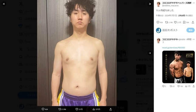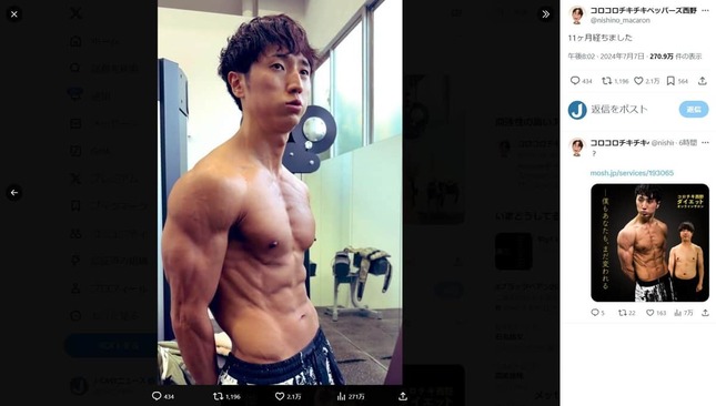 筋トレによる「肉体改造」をXで報告し、その激変ぶりが話題となっている、お笑いコンビ・コロコロチキチキペッパーズの西野創人さん。2024年7月7日には自身のXで、「11ヶ月経ちました」として、現在の鍛え上げられた肉体を披露した。