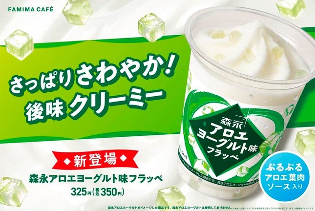 今回の新商品は、コーヒーマシンのミルクで作る「FAMIMA CAFE」のフラッペシリーズから登場。ヨーグルト味の氷とクリームの2層仕立てで、クリーミーな味わいと酸味を再現。アロエ葉肉の粒入りで、食感も楽しめる。