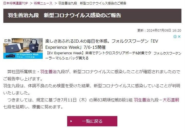 日本将棋連盟は2024年7月9日に、棋士の羽生善治九段が新型コロナウイルスに感染したことを発表した。