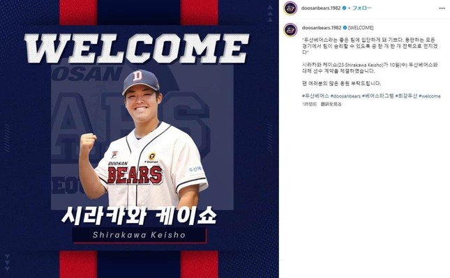 • 斗山に移籍した白川(斗山インスタグラムより)
